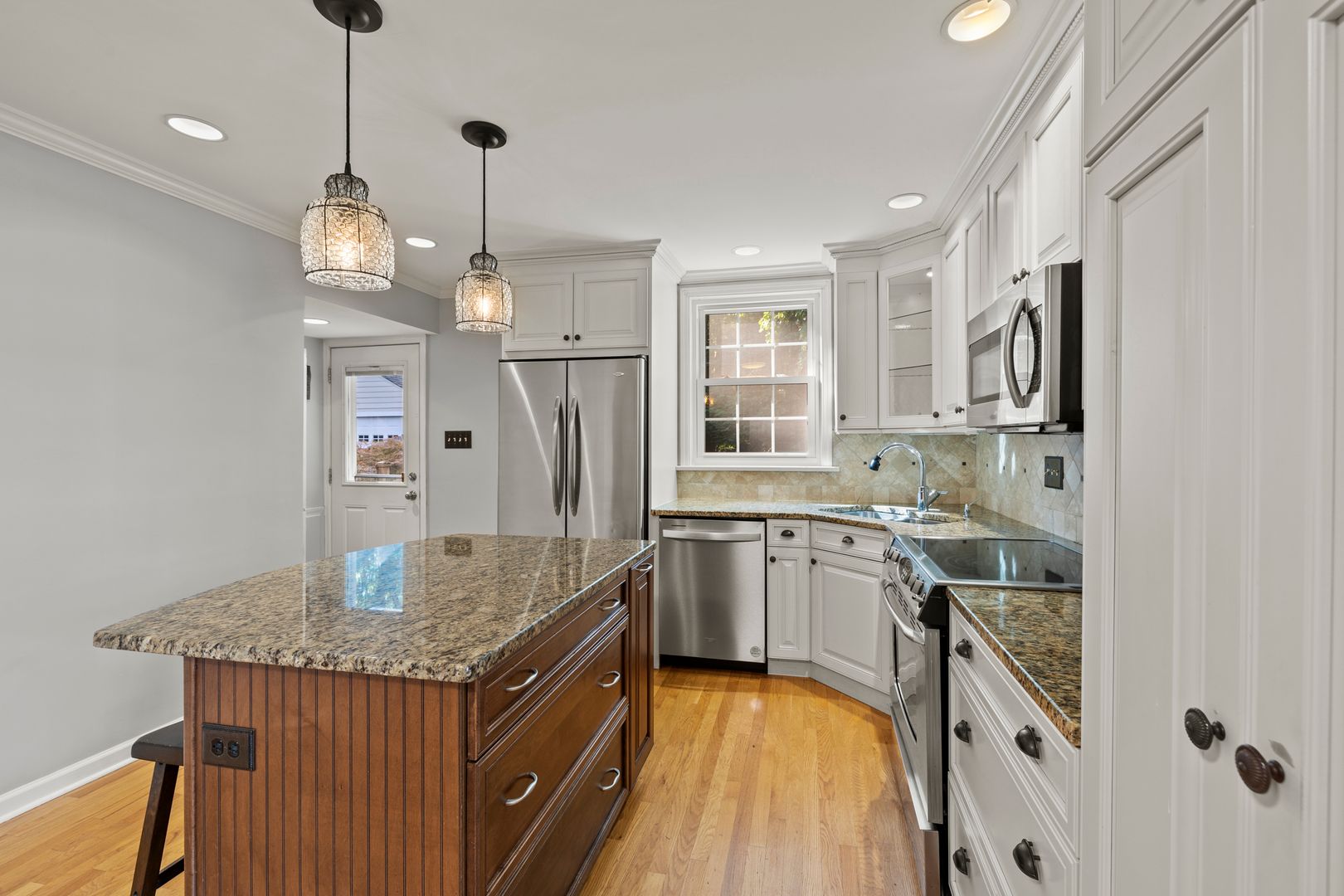 Two full baths!! Granite counters, stainless appliances, Tesla Outlet, fenced yard, huge two car garage, central air, partially finished basement.